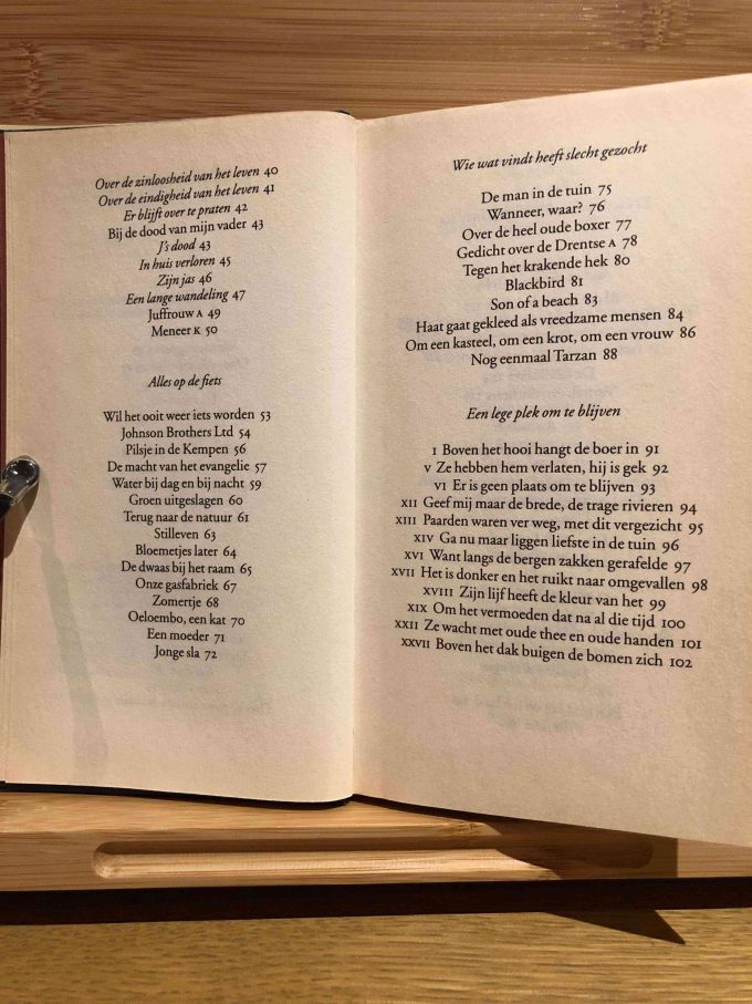 In this anthology, Kopland often addresses the theme of loss and transience, resisting the romantic idealization of the past. His style is marked by the use of irony, exaggeration, and relativization, serving as tools to temper the melancholy of what has been lost. Although nature in his poems often highlights the impermanence of life, Kopland also describes moments of intense joy where time seems to stand still.