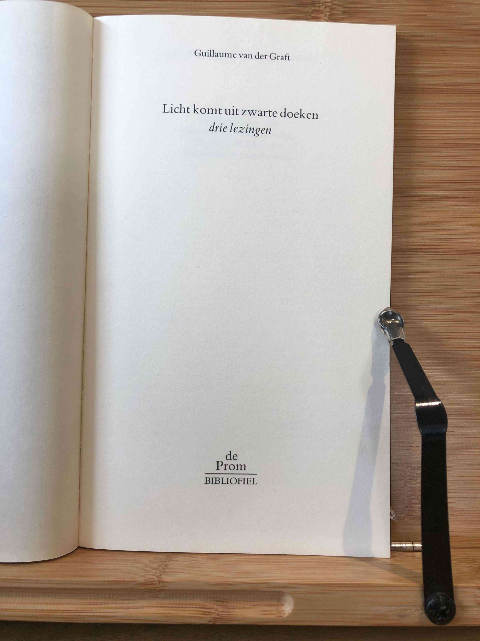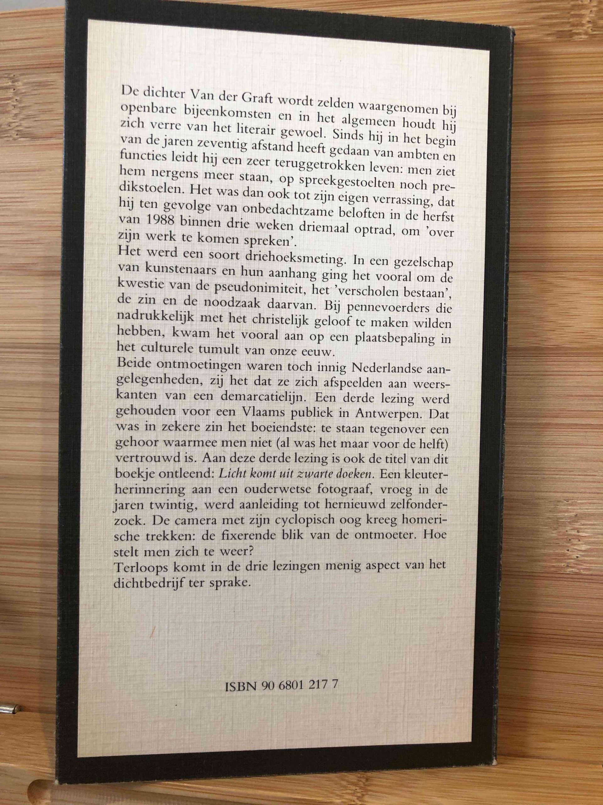 Licht komt uit zwarte doeken door Guillaume Van Der Graft is een bundel met drie lezingen, gepubliceerd door De Prom in 1988 als onderdeel van de reeks “De Prom Bibliofiel”. Dit eerste deel van de serie is 60 pagina’s lang en heeft een formaat van 12 cm bij 20,5 cm. Het boekje is in uitstekende staat, met een zachte kaft en perfecte binding.