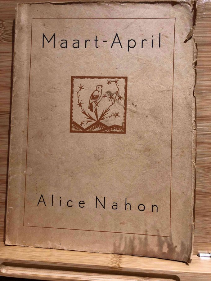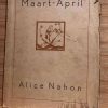 Alice Nahon’s “Maart-April. Jeugdgedichten en nagelaten verzen” is een poëziebundel die in 1942 werd uitgegeven door De Nederlandsche Boekhandel in Antwerpen en A. W. Sythoff in Leiden. Deze derde editie bestaat uit 65 pagina’s en heeft een formaat van 16 cm bij 21,5 cm. Het boek verkeert in matige staat vanwege waterschade aan de onderranden en heeft een zachte kaft met genaaide binding.