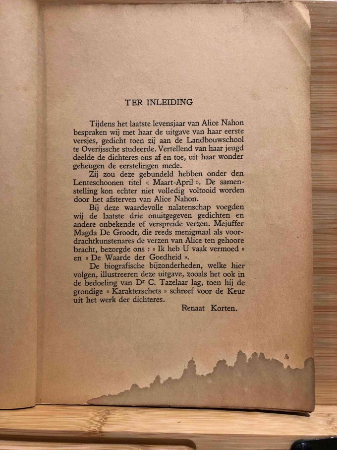 The collection Maart-April contains juvenile poems and posthumous verses, compiled and annotated with biographical details by Renaat Korten. This work offers deeper insight into Nahon’s early poetic talent and her development as a poet. Despite her health issues, her poetry remained productive until her late years and continues to hold an important place in Flemish literature.