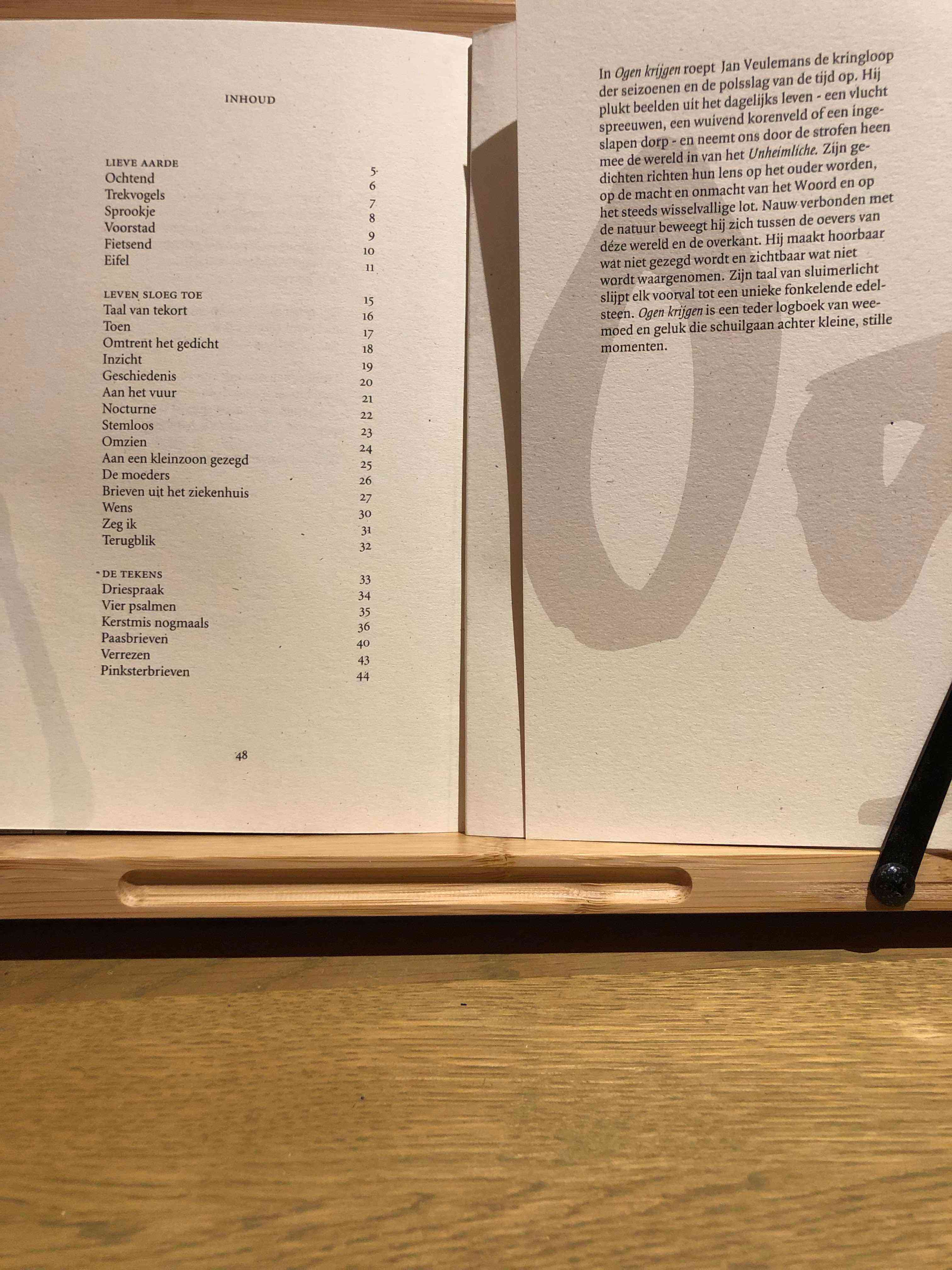 Veulemans is closely connected to nature and moves between the boundaries of this world and the beyond. His poetry makes audible what is unsaid and visible what is unseen, using the language of twilight to polish each occurrence into a unique, sparkling gem. Ogen krijgen serves as a tender logbook of melancholy and happiness that hide behind small, quiet moments in life.