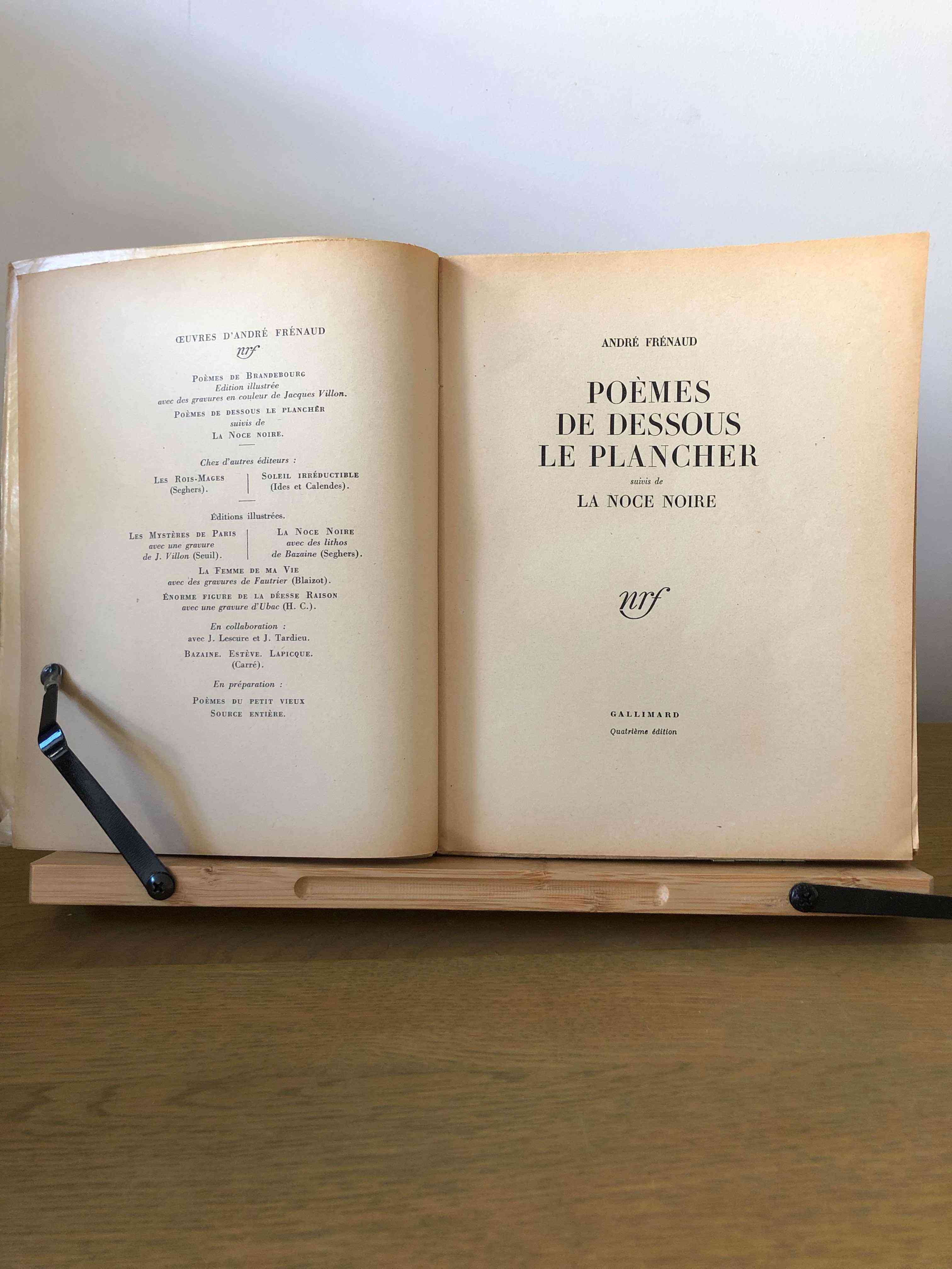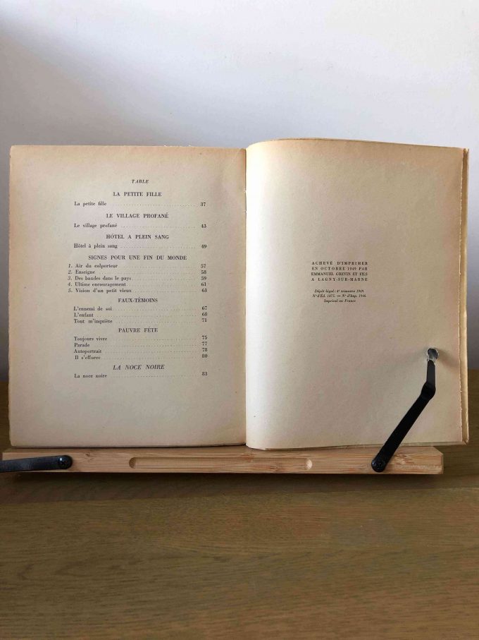 “Poèmes de dessous le plancher / La noce noire” is a poetic work by André Frénaud, published by Gallimard in 1949 and printed by Emmanuel Grevin et Fils in Lagny-Sur-Marne. This fourth edition comprises 93 pages and measures 19 cm x 24 cm. The book is in fine condition, uncut, and presented in a softcover with a dust jacket. The binding is sewn.