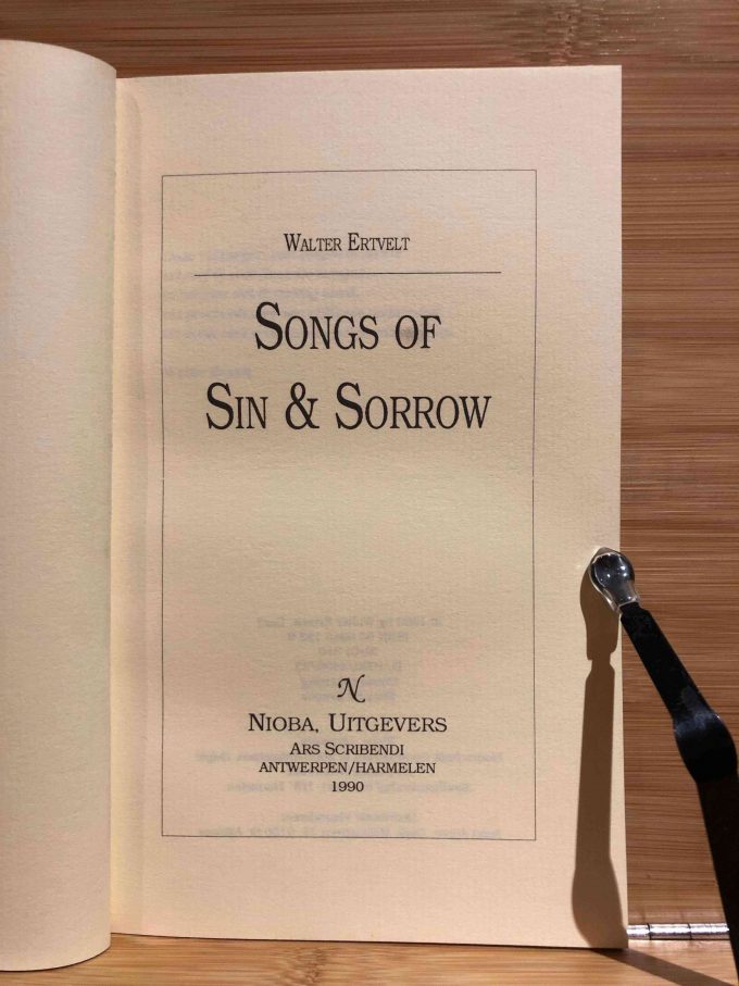 Ertvelt, Walter. Songs of Sin & Sorrow. Antwerpen / Harmelen: Nioba / Ars Scribendi, 1990. 58 pages. 1 Volume. [First Edition]. 12,5 cm. x 20 cm. Softcover. Perfect binding. Condition: Good.
