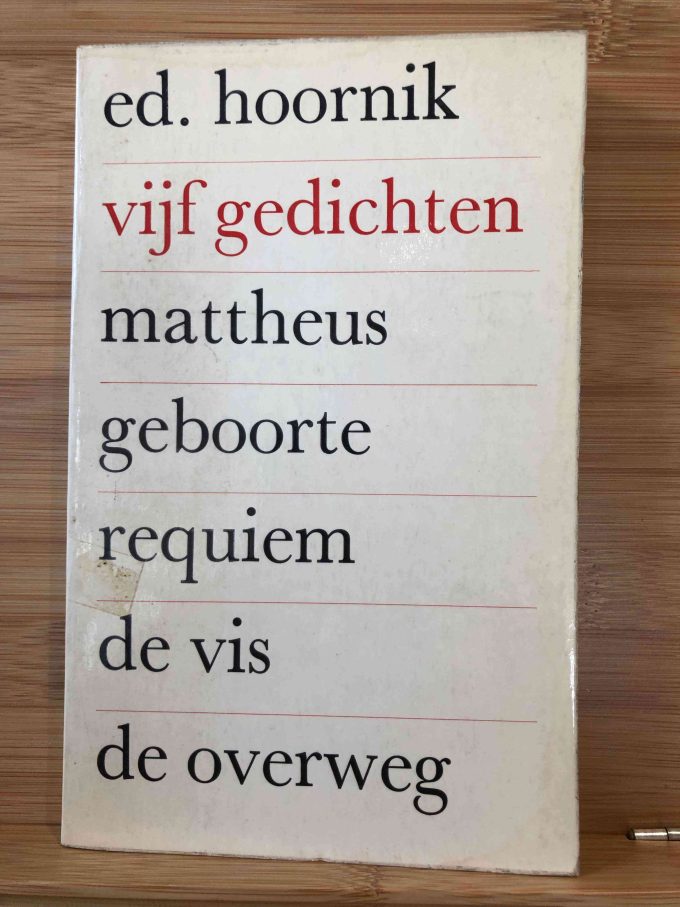 Hoornik, Ed.. Vijf Gedichten: Mattheus / Geboorte / Requiem / De vis / De overweg. Amsterdam: J.m. Meulenhoff, 1966. Printed by Bosch, Utrecht. 122 pages. 1 Volume. Series: Meulenhoff Editie. [First Edition]. Meulenhoff Editie E 95. 12,5 cm. x 20 cm. Softcover. Sewn binding. Condition: Fine.