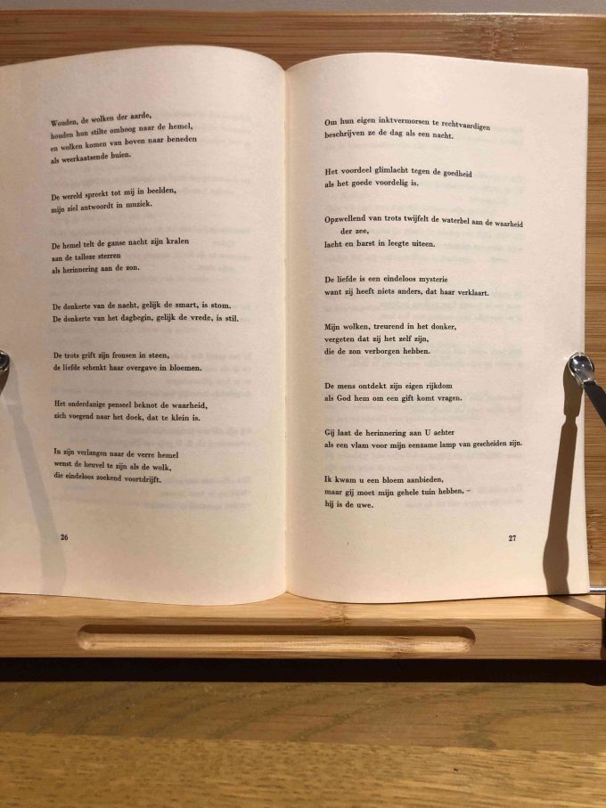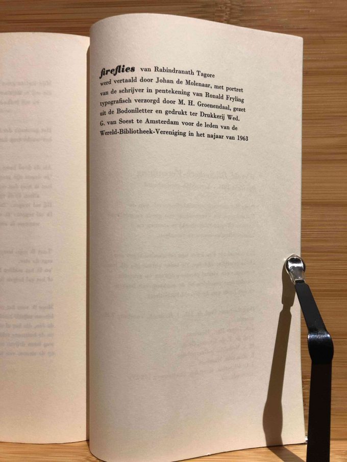 “Vuurvliegen” (Fireflies) is a small collection of aphorisms translated by Johan de Molenaar. It was published by the Wereld-bibliotheek-vereniging in Amsterdam / Antwerp in 1963. This first edition consists of 45 pages and measures 12.3 cm by 20 cm. The aphorisms in this collection are scattered thoughts that Tagore originally wrote on fans and pieces of silk in China and Japan. The themes of these aphorisms are deeply rooted in the motifs that Tagore explored throughout his life and work.