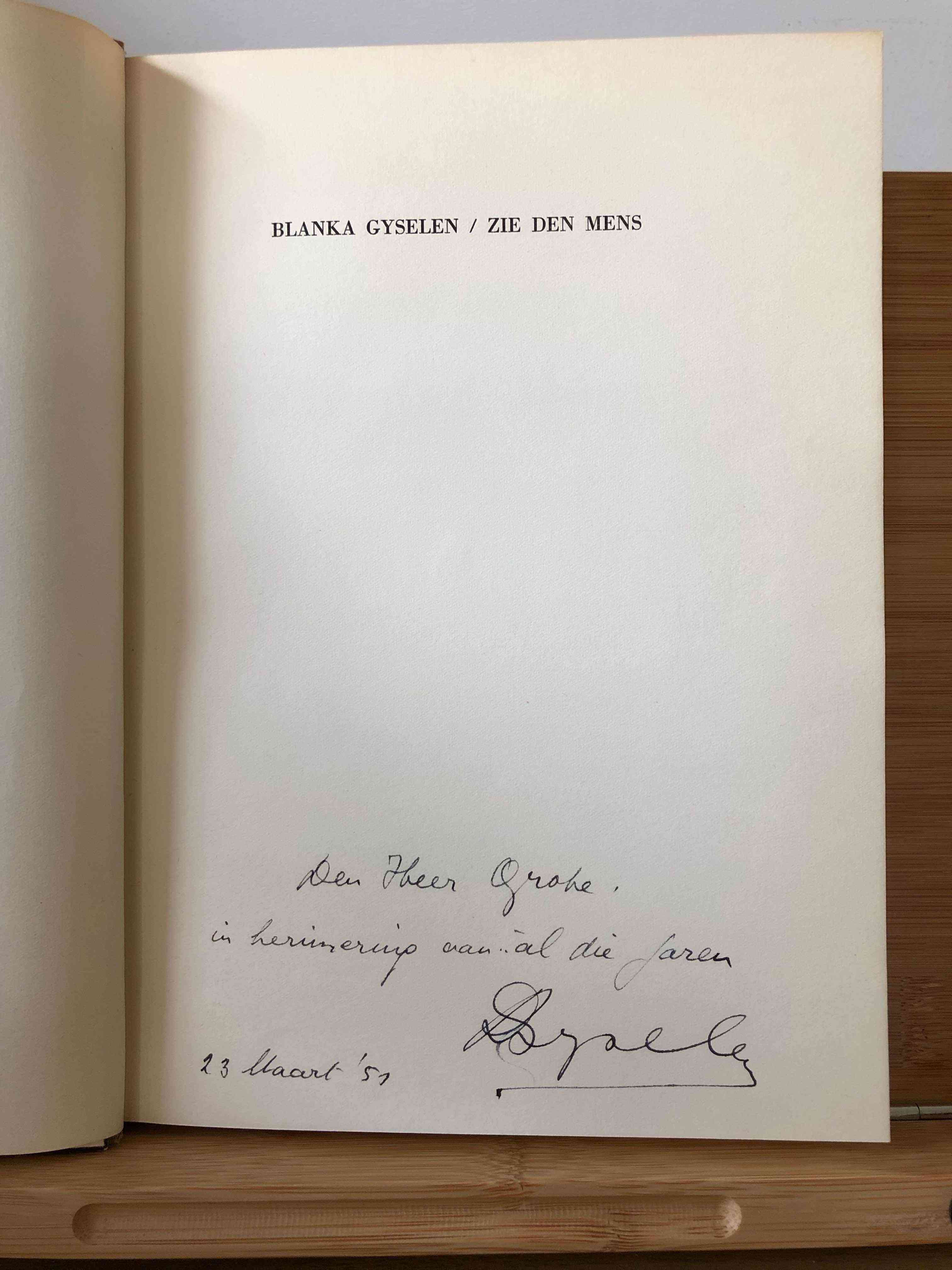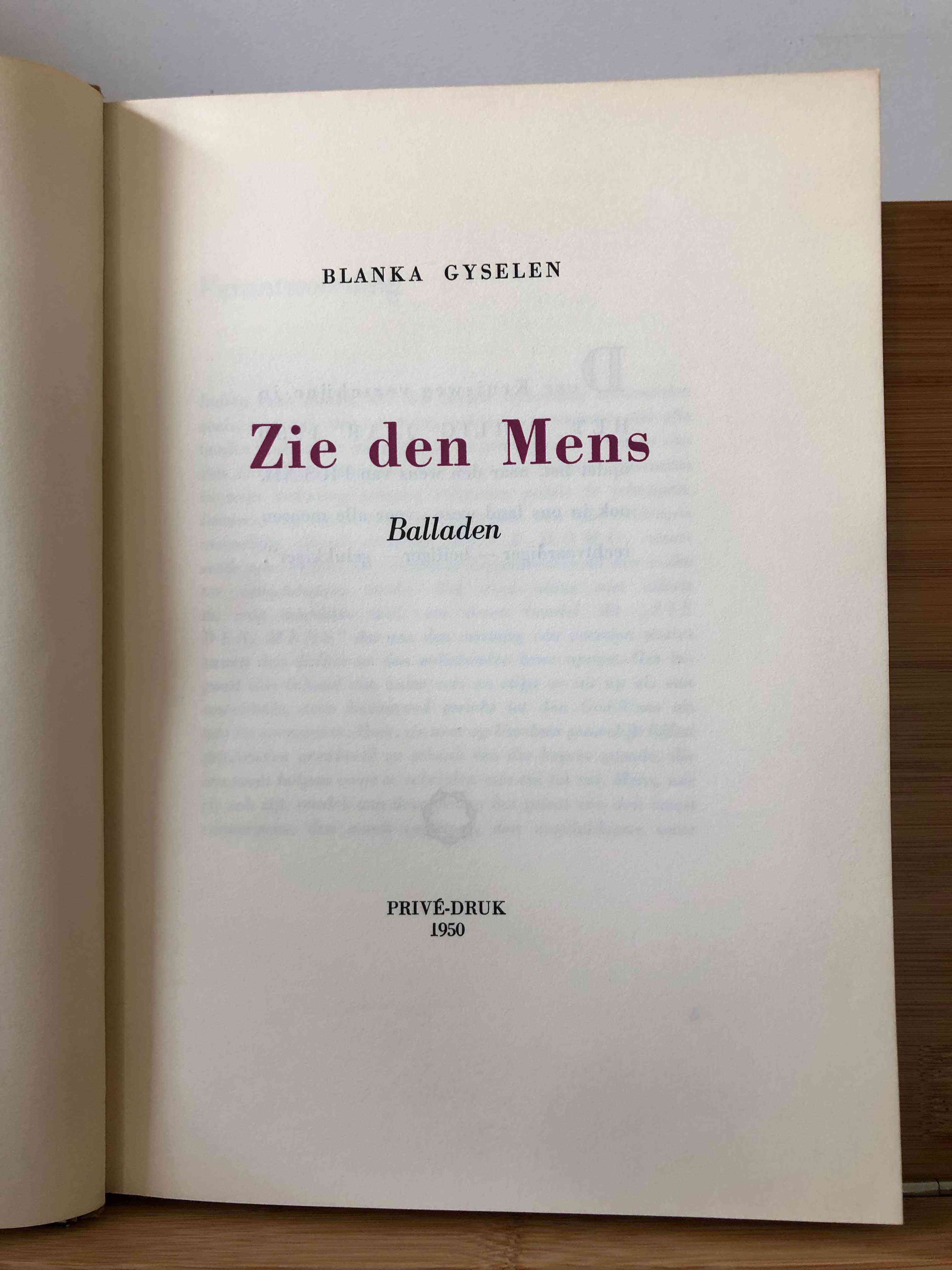 Zie den Mens. Balladen door Blanka Gyselen, een privé-druk gepubliceerd in 1950 en gedrukt door Michiels in Antwerpen, telt 67 pagina’s. Dit is de eerste editie, gedrukt in twee kleuren. Het boek meet 18 cm x 25 cm en verkeert in uitstekende staat met een genaaide softcover. Dit exemplaar bevat een handtekening en een persoonlijke opdracht van de auteur: “Den Heer Grohe, in herinnering aan al die jaren, 23 Maart 51”. Daarnaast bevat het boek twee krantenartikelen uit 1951 die deze dichtbundel recenseren, evenals een “In Memoriam” kaart van de auteur, die in 1959 overleed.