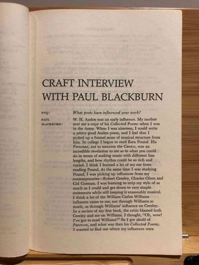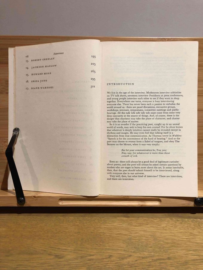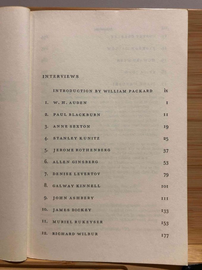 The book includes interviews with the following poets: W. H. Auden, Paul Blackburn, Anne Sexton, Stanley Kunitz, Jerome Rothenberg, Allen Ginsberg, Denise Levertov, Galway Kinnell, John Dickey, Muriel Rukeyser, Richard Wilbur, Robert Creeley, Jackson Maclow, Howard Moss, Erica Jong, and Diane Wakoski.