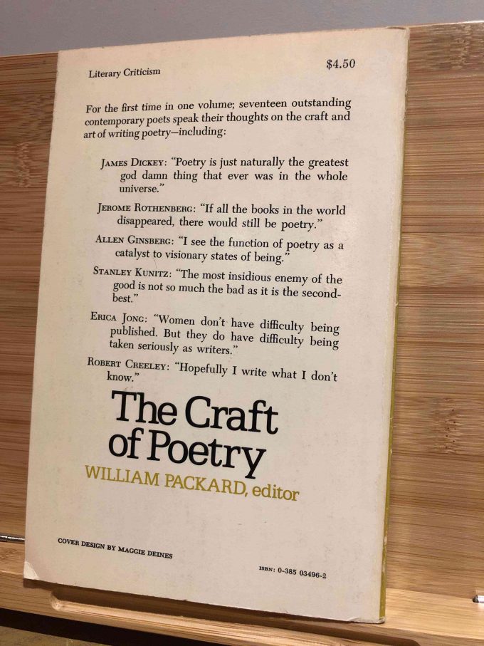 The Craft of Poetry is a compilation by William Packard, published in 1974 by Doubleday & Company in New York. This book, consisting of 340 pages, is the fifth edition and measures 13.5 cm x 20.5 cm. This copy is in fine condition and features a softcover with perfect binding.