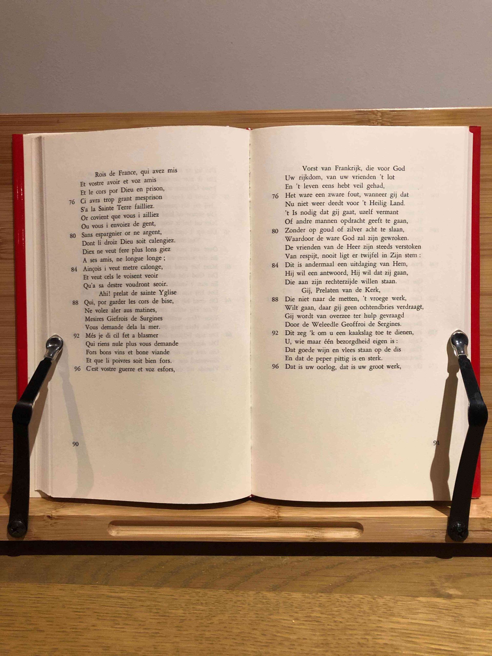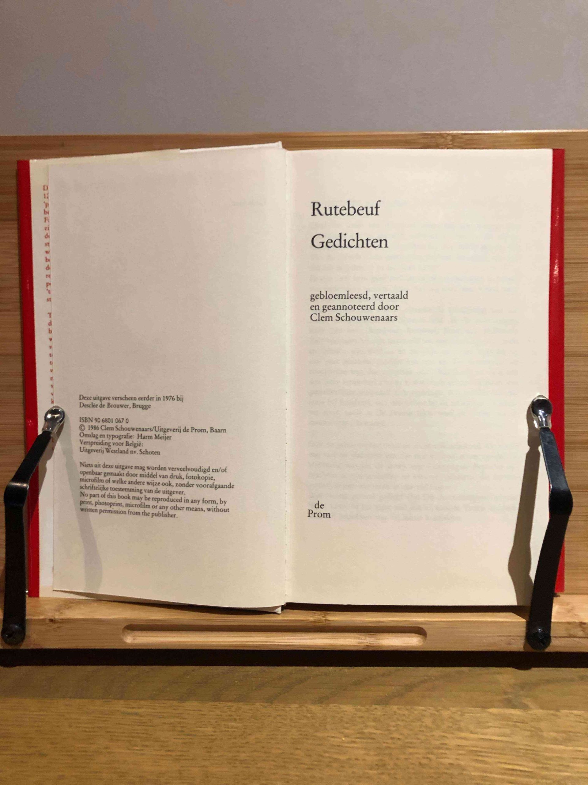 De Franse dichter Rutebeuf leefde in de eerste helft van de 13e eeuw. Wat we over zijn leven weten komt uit zijn gedichten, want hij was een van de eerste Europese dichters die het eigen ik en de eigen omstandigheden tot onderwerp van zijn verzen koos. Daarmee is hij een kleurrijk sleutelfiguur. De Vlaamse auteur Clem Schouwenaars deed een keuze uit Rutebeufs werk en zijn uitgever deed er een fraaie band omheen.