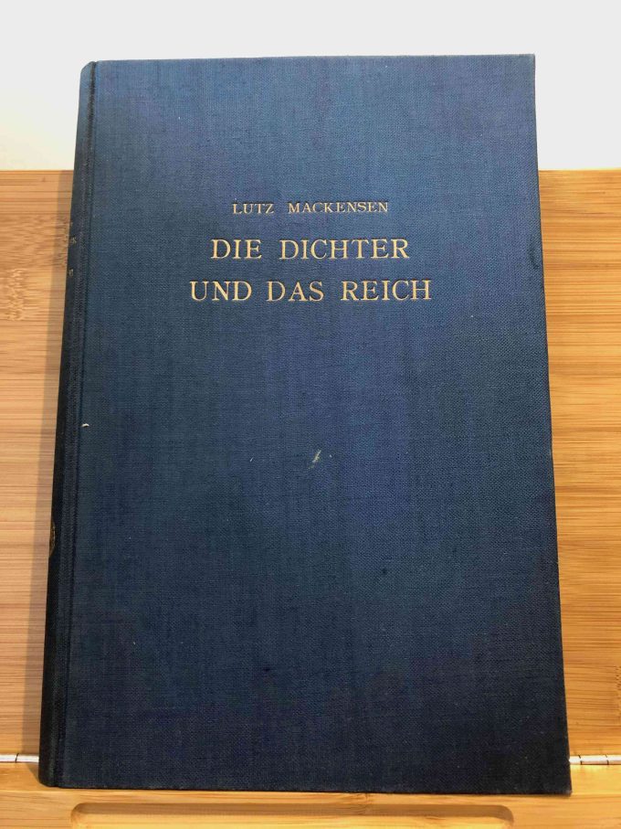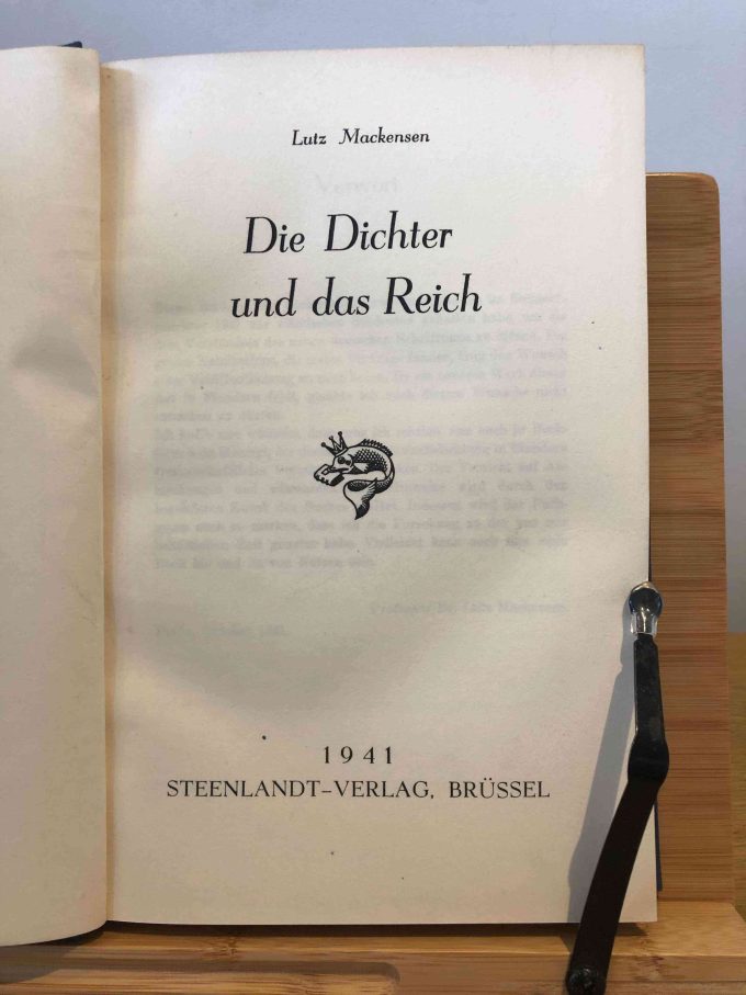 Mackensen, Lutz. Die Dichter und das Reich. Brüssel: Steenlandt, 1941. 253 pages. 1 Volume. [First Edition]. 17 cm. x 25,5 cm. Full cloth hardcover. Sewn binding. Condition: Fine Plus.