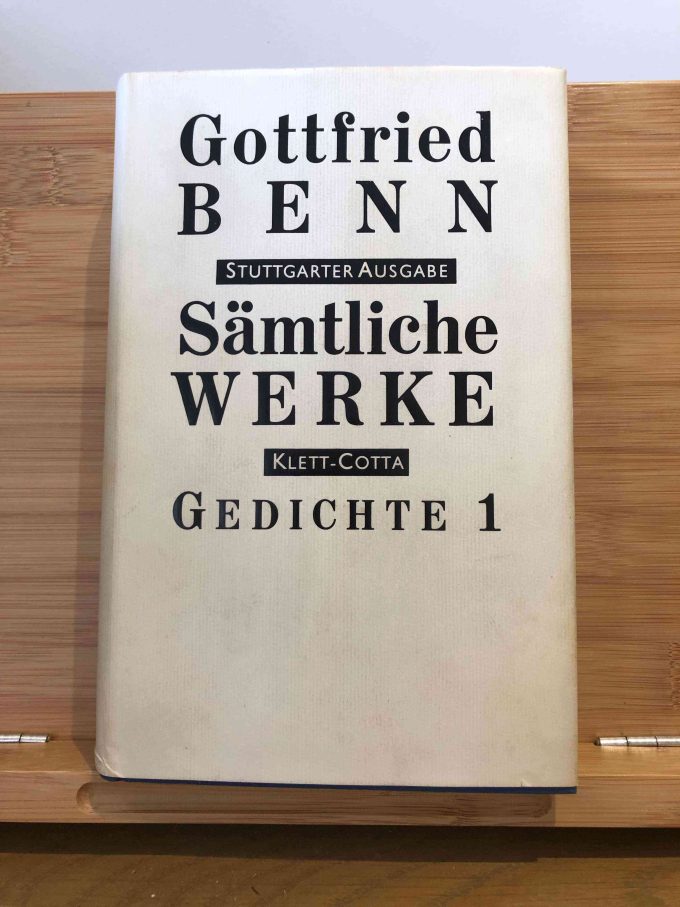 Benn, Gottfried. Gottfried Benn: Sämtliche Werke. Stuttgart: Klett-Cotta, 1986. 587 pages. 1 Volume. Revised Edition. 13,5 cm. x 20,5 cm. Hardcover with Dust Jacket. Sewn binding. Condition: Fine.