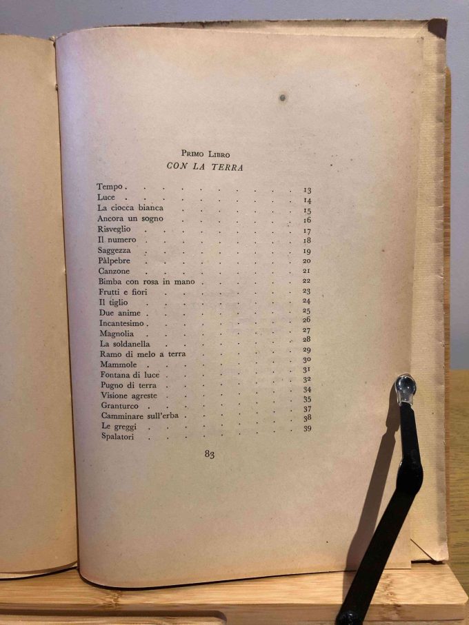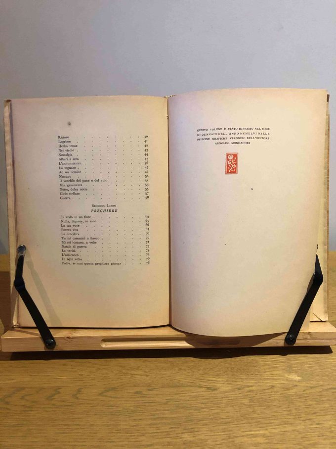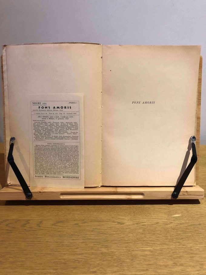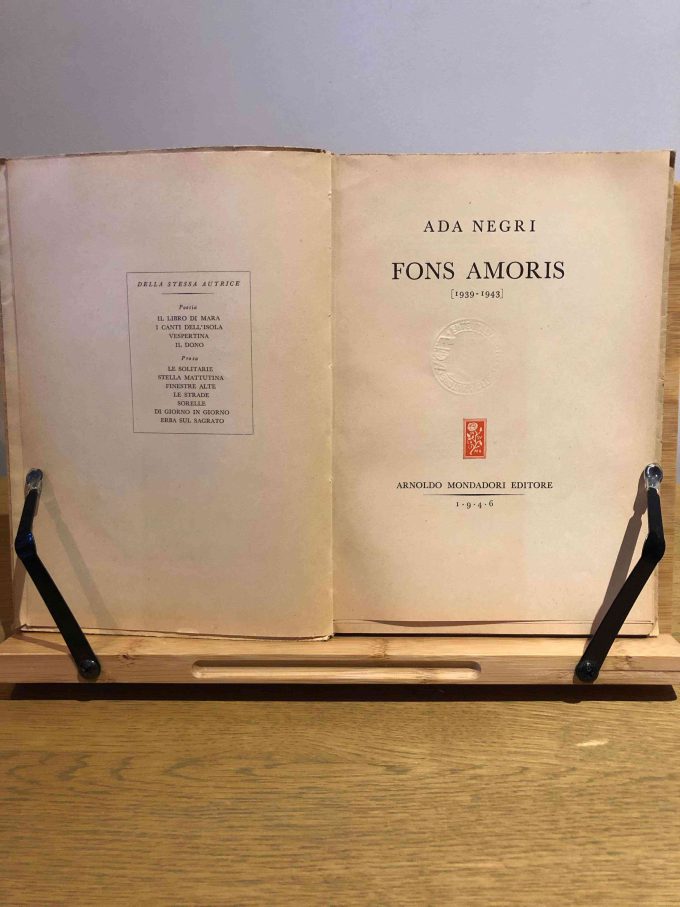 Ada Negri, “Fons Amoris (1939-1943)” è un’edizione postuma, pubblicata da Arnoldo Mondadori a Verona nel 1946. Il libro contiene le ultime poesie della poetessa italiana Ada Negri, scritte tra il 1939 e il 1943. Negri decise di non pubblicare queste poesie durante la guerra. Questa prima edizione consta di 83 pagine e misura 16,6 cm per 23,8 cm. Il libro è in ottime condizioni, con copertina morbida e rilegatura cucita.