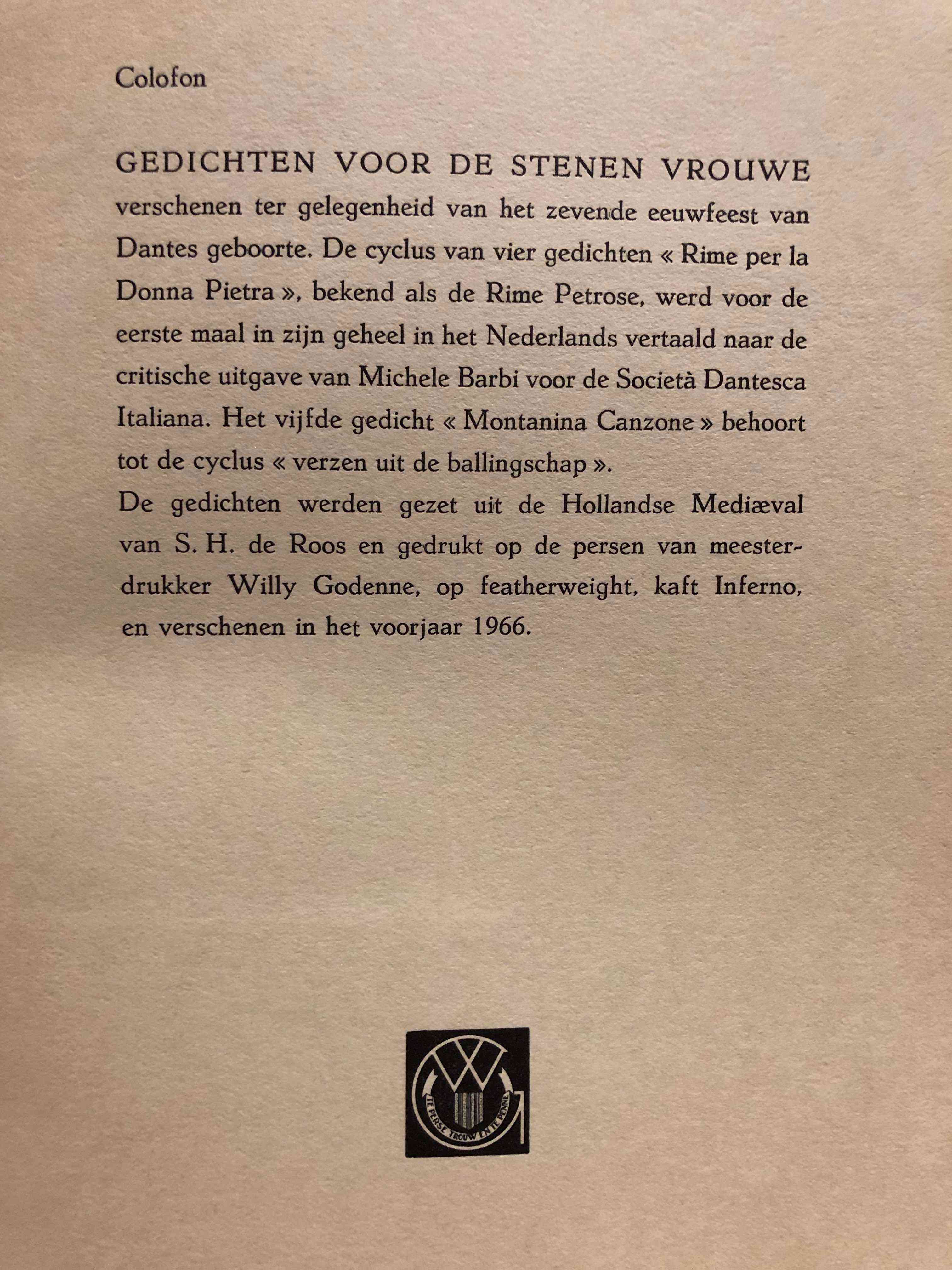 Rime per la donna pietra – Gedichten voor de stenen vrouwe (Poems for the Stone Lady) is a collection of poems by Dante Alighieri, translated by Renaat Joostens under the pseudonym Albe. The book was published in 1966 by W. Godenne in Brussels and printed by Willy Godenne. This first edition, consisting of 35 pages, is extremely rare and measures 19.5 cm x 26.5 cm. The volume is in fine condition with a sewn softcover.