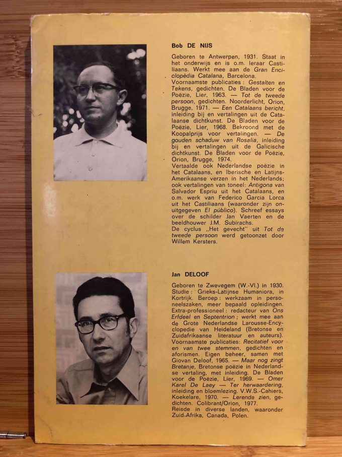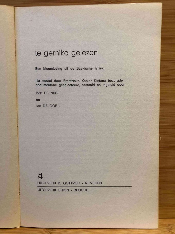 “Te Gernika gelezen” is een bloemlezing uit de Baskische lyriek, vertaald en ingeleid door Rob De Nijs en Jan Deloof, gepubliceerd door B. Gottmer / Orion in 1978. Deze eerste editie, bestaande uit 93 pagina’s, maakt deel uit van de reeks “De bladen voor de poëzie” en heeft een formaat van 13,5 cm bij 21 cm. Het boek is in uitstekende staat en heeft een zachte kaft met genaaide binding.