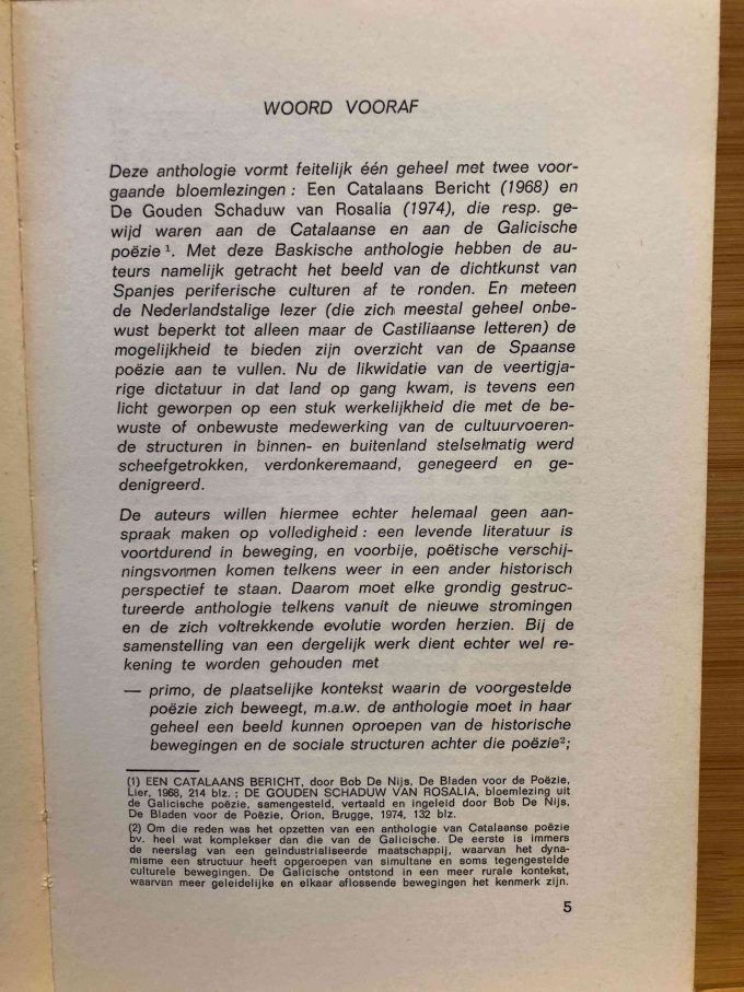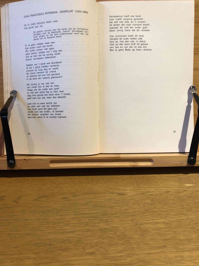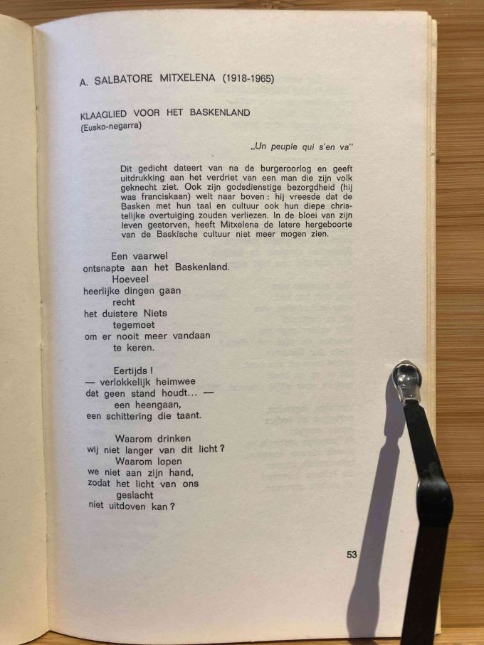 Gernika is wereldwijd bekend geworden door Picasso’s beroemde schilderij “Guernica” en heeft tragische actualiteit door de Baskische afscheidingsbeweging ETA. Het Baskisch is een lokale taal die alle overheersingen heeft overleefd dankzij het gehandhaafde isolement. Deze bundel Baskische lyriek is wetenschappelijk van aard door de bekwame inleidingen en verantwoorde herdichtingen, ingedeeld in drie hoofdstukken. Het begint met Iparragirre’s “De boom van Gernika”, het zinnebeeld van de Baskische vrijheidsstrijd, en eindigt met de jongste strijdbare dichters “die ons het meest nabij zijn”, zoals de samenstellers zelf verklaren. De derde afdeling bevat vooral prachtige en krachtige verzen, waarbij de vertalingen de indruk wekken dat de auteurs zich hebben geïdentificeerd met hun inspiratiebron.
